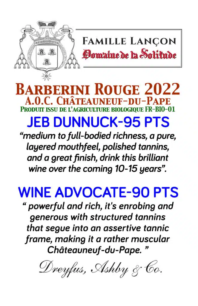 Cuvée Barberini Red – It is a tribute to our ancestors the Barberini Family, produced when the vintage allows it from a special selection from our domaine, well known for its concentration and its opulence. The modern winemaking style, with optimization of the extraction but without excess, gives a powerful wine with silky tannins. Depending on the vintage, a part more or less is aged 16 months in barrels, and then when the blending is made, is going to spend 6 months in tanks for a perfect integration. Impressive wine, with a significant purity and density, can best be served for tasting between 4 and 15 years at least after the vintage year.