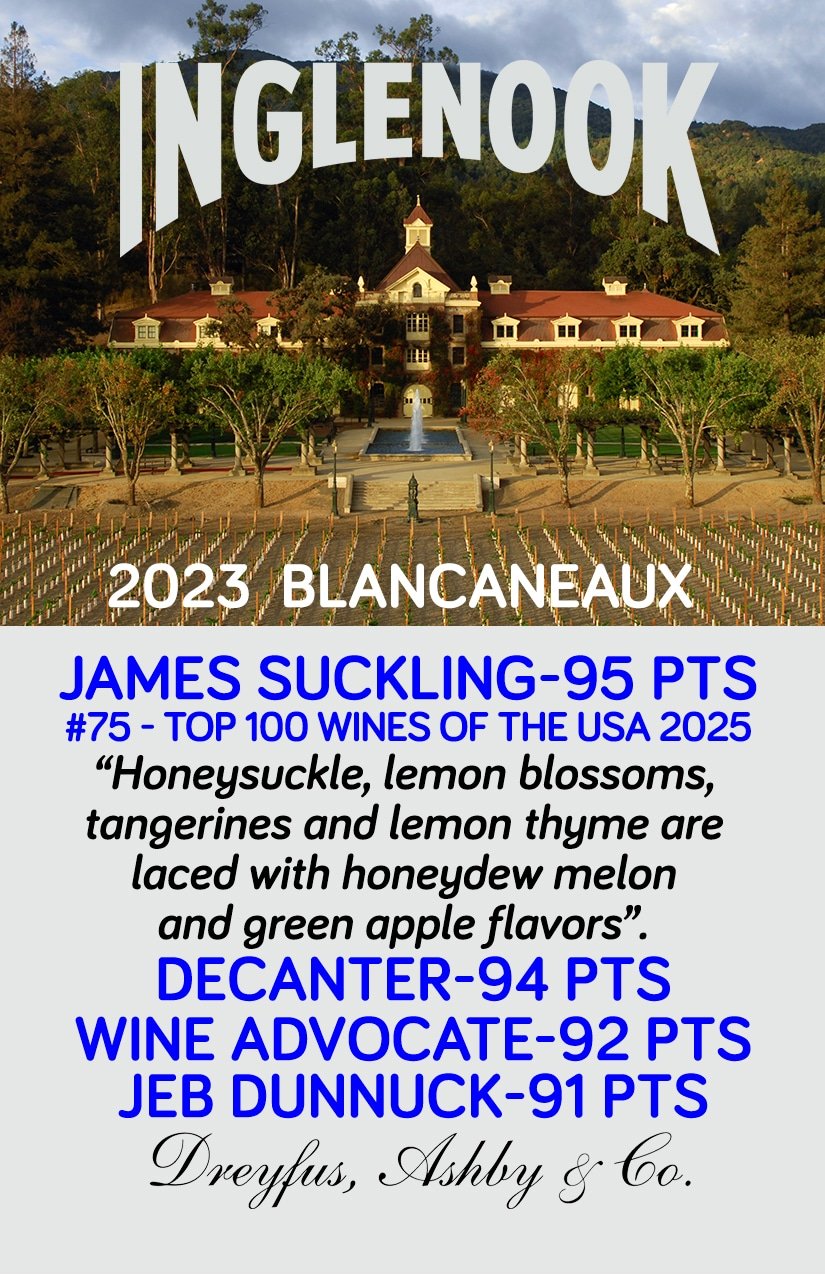 The 2023 Inglenook Blancaneaux, a blend of Marsanne, Roussanne, and Viognier, opens with beautiful white floral aromas elegantly balanced with a touch of lemon. On the palate, the roundness from the Viognier provides a smooth and supple texture, while the finish is lengthy and graceful. Subtle aromas of coriander add a layer of complexity, making this wine both aromatic and well-balanced.