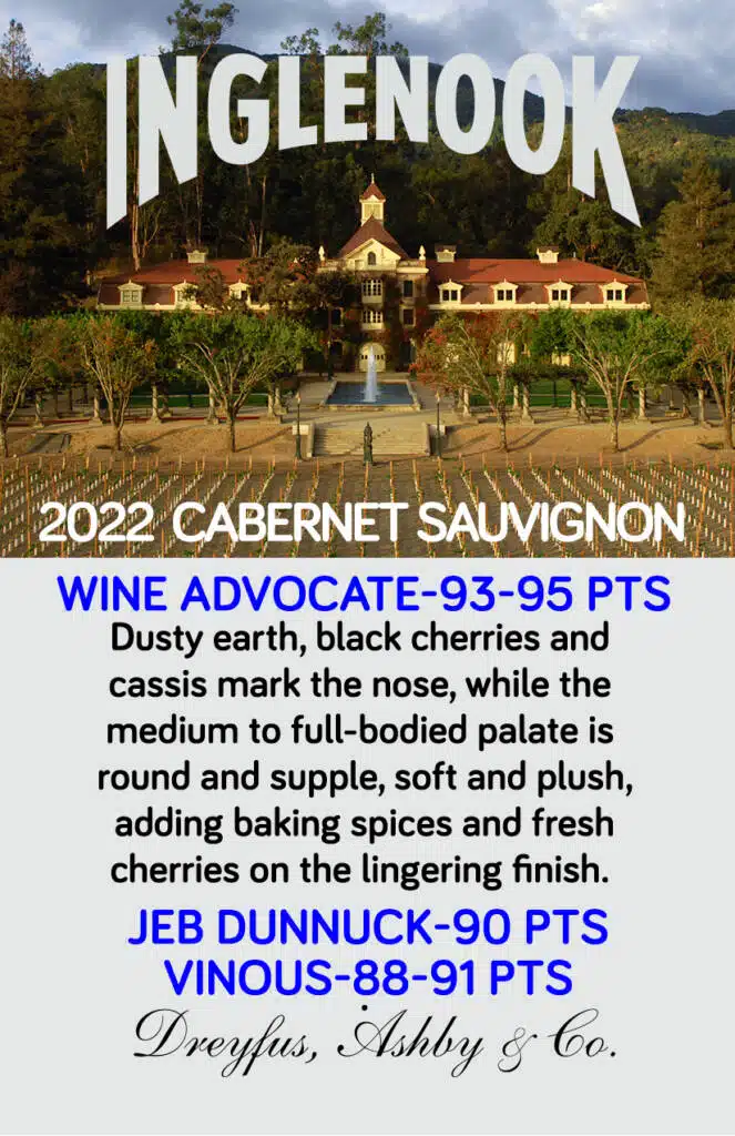 Francis Ford Coppola purchased parts of the historic Inglenook Estate in 1975, the remaining portions of the property in 1995, and acquired the right to use the name Inglenook in 2011. Today this exceptional wine is made from organically grown grapes grown on the Coppola family estate. It is 95 percent Cabernet Sauvignon with the addition of Cabernet Franc, Merlot, and Petit Verdot. It is ruby garnet in color with aromas of black raspberry, black plum, coffee, forest floor, and cigar box. It has flavors of ripe red and black fruits with a touch of cedar shavings and pencil lead in the post palate. The tannins are silky smooth and the finish just keeps going.