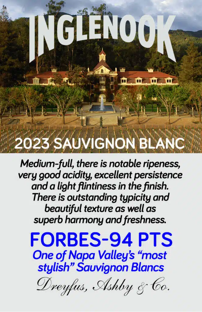 The 2023 Inglenook Sauvignon Blanc offers a refreshing burst of lime zest on the nose, accompanied by the crisp scent of fresh cut grass. The wine showcases a distinct minerality, with a flinty character reminiscent of the mineral-rich soils of Mt. St. John. This wine is lively and invigorating, with a clean, focused finish that highlights its natural freshness.