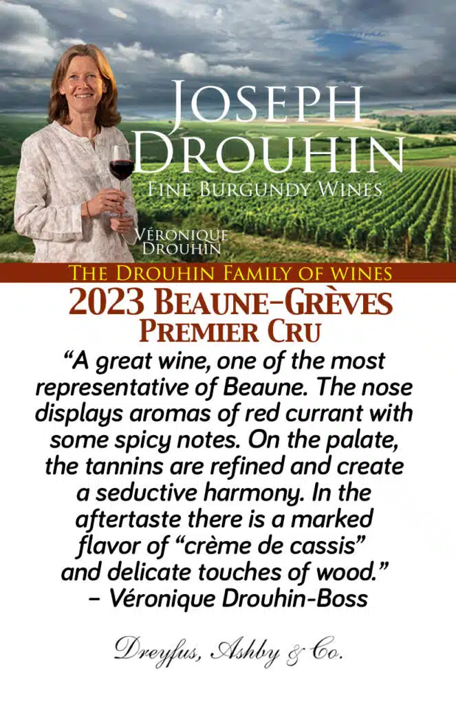 “A great wine, one of the most representative of Beaune, the capital of Burgundy. Intense and bright red color. The nose displays aromas of red currant with some spicy notes. With age and in some vintages, the aromas become even more marked by spicy and smoky touches, such as tobacco. On the palate, the tannins are refined and create a seductive harmony. In the aftertaste there is a marked flavor of “crème de cassis” (cream of black currant) and delicate touches of wood.” – Véronique Drouhin-Boss
