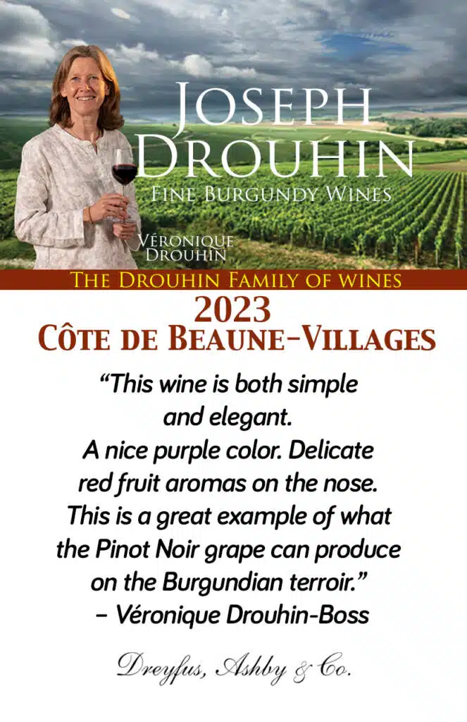 “This wine is both simple and elegant. A nice purple color. Delicate red fruit aromas on the nose. This is a great example of what the Pinot Noir grape can produce on the Burgundian terroir.” – Véronique Drouhin-Boss