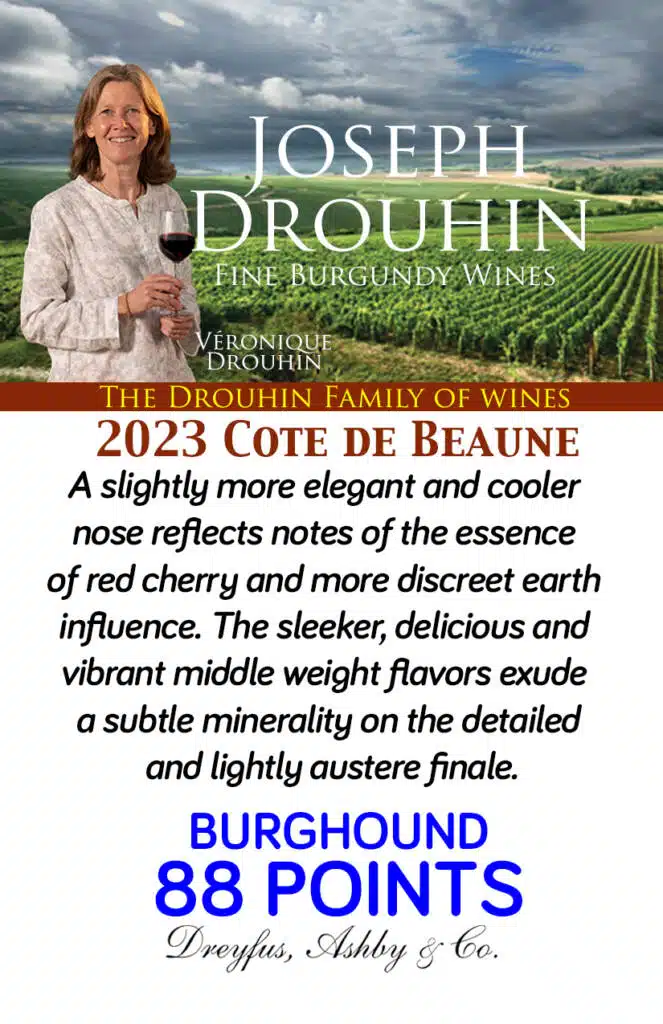 “A true delight and a great harmony! A beautiful purple color. On the nose, delicate and fruity aromas such as strawberry and red currant. On the palate, the tannins are refined and lend a nice roundness to the body. Elegant aftertaste”. – Véronique Drouhin-Boss