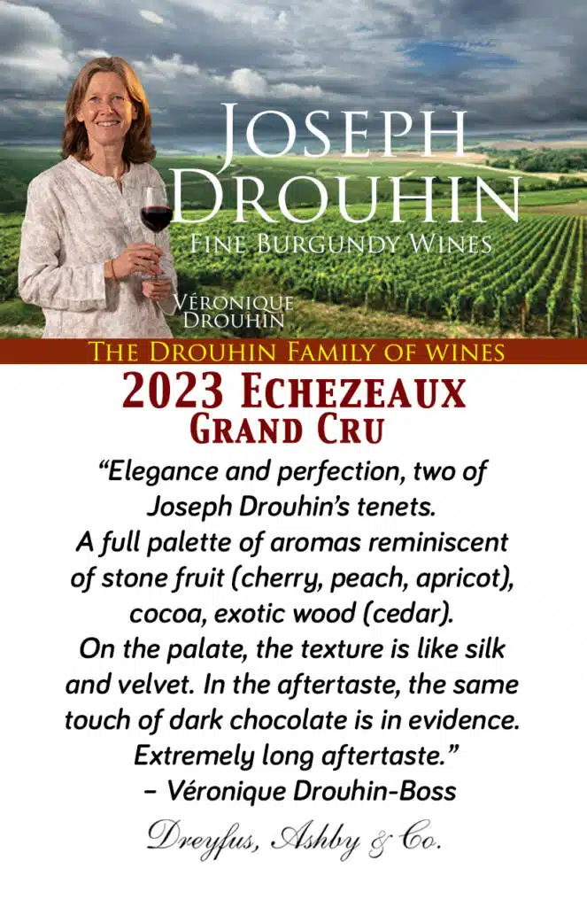 TASTING NOTES: “Elegance and perfection, two of Joseph Drouhin’s tenets. The color is bright and intense. A full palette of aromas reminiscent of stone fruit (cherry, peach, apricot), cocoa, exotic wood (cedar). On the palate, the texture is like silk and velvet. In the aftertaste, the same touch of dark chocolate is in evidence. Extremely long aftertaste.” – Véronique Drouhin-Boss