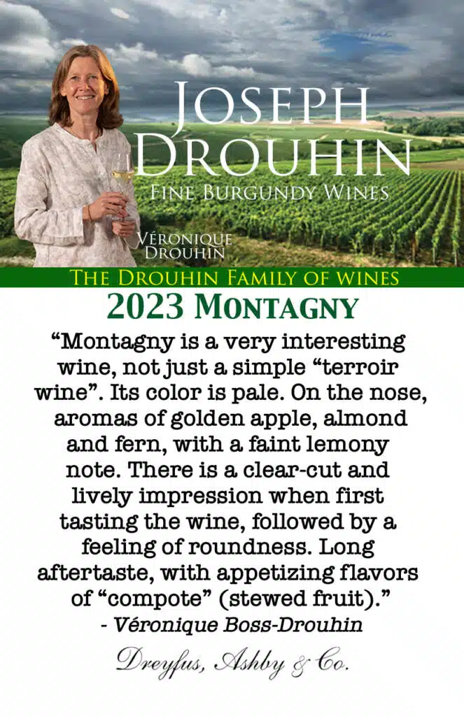 “Montagny is a very interesting wine, not just a simple “terroir wine”. Its color is pale. On the nose, aromas of golden apple, almond and fern, with a faint lemony note. There is a clear-cut and lively impression when first tasting the wine, followed by a feeling of roundness. Long aftertaste, with appetizing flavors of “compote” (stewed fruit).” – Véronique Boss-Drouhin