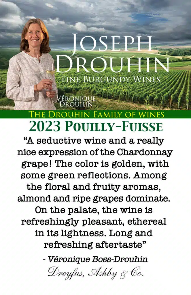 “A seductive wine and a really nice expression of the Chardonnay grape! The color is golden, with some green reflections. Among the floral and fruity aromas, almond and ripe grapes dominate. On the palate, the wine is refreshingly pleasant, ethereal in its lightness. Long and refreshing aftertaste”. – Veronique Boss- Drouhin