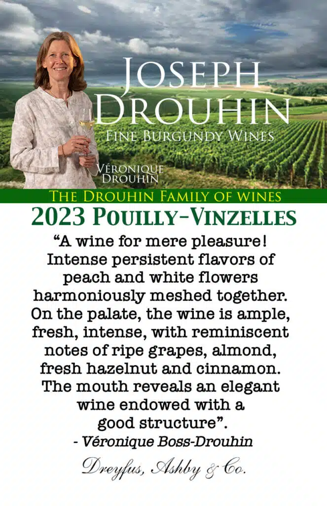 “A wine for mere pleasure! Pale yellow color with numerous bright green reflections. Intense persistent flavors of peach and white flowers harmoniously meshed together. On the palate, the wine is ample, fresh, intense, with reminiscent notes of ripe grapes, almond, fresh hazelnut and cinnamon. The mouth reveals an elegant wine endowed with a good structure”.. – Veronique Boss-Drouhin