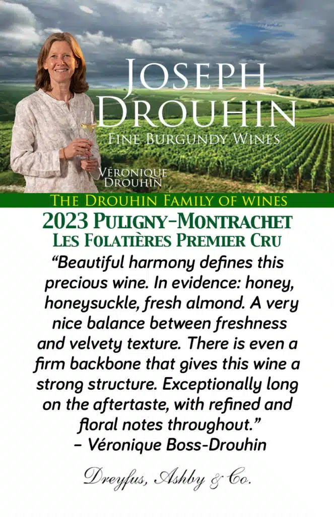 “Beautiful harmony defines this precious wine. Golden and bright color. The complex and distinctive aromas of Puligny are here in evidence: honey, honeysuckle, fresh almond. As the wine matures, these aromas evolve towards dried fruit notes and spice. On the palate, a very nice balance between freshness and velvety texture. There is even a firm backbone that gives this wine a strong structure. Exceptionally long on the aftertaste, with refined and floral notes throughout.” – Véronique Boss-Drouhin