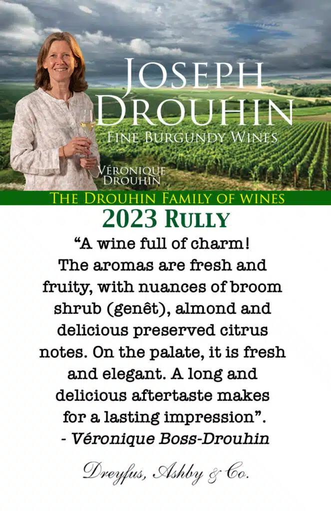 “A wine full of charm! The color is a beautiful white gold, with a ravishing purity and brilliance. The aromas are fresh and fruity, with nuances of broom shrub (genêt), almond and delicious preserved citrus notes. On the palate, it is fresh and elegant. A long and delicious aftertaste makes for a lasting impression”. – Véronique Boss-Drouhin
