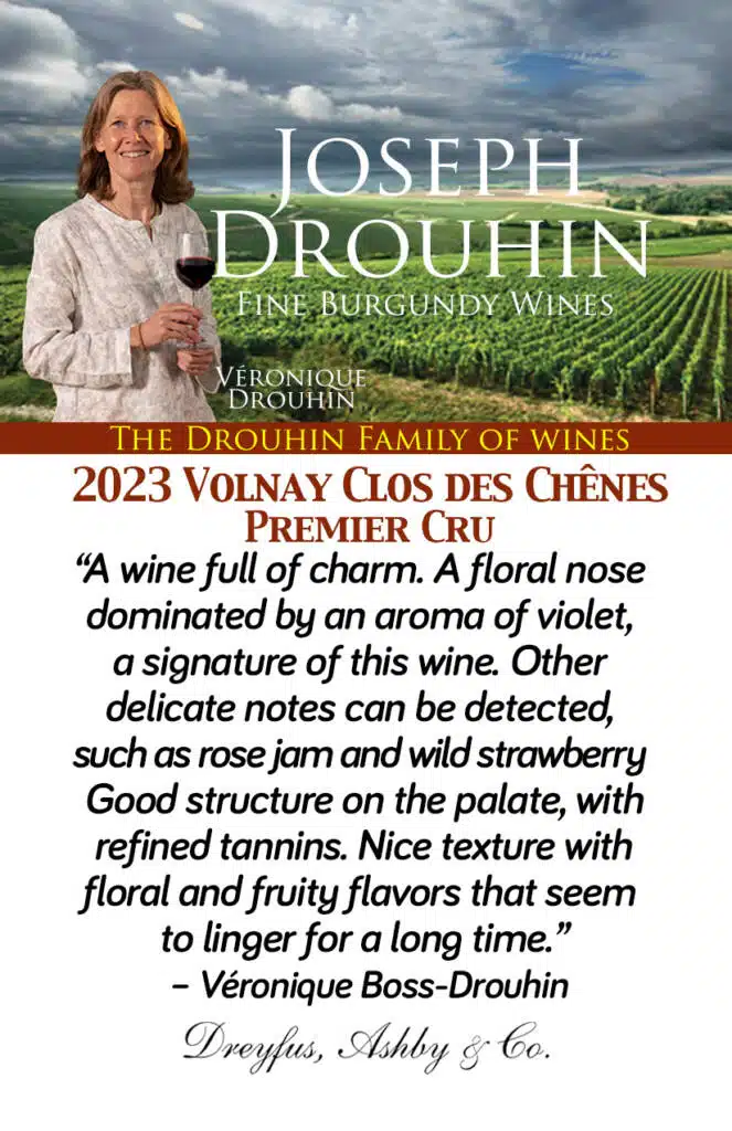 - Volnay Clos des Chênes produces a remarkable wine, especially when tradition is respected. Robert Drouhin is fond of saying: “Enology is necessary but should never displace our traditions. If too much technology is used, all wines taste alike. They become neither good nor bad, just average. On the other hand, common sense and a deep respect for tradition will guarantee the individuality and quality that only terroir can offer”.